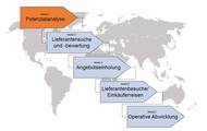 Im Mittelpunkt stehen die Ermittlung des für den internationalen Einkauf geeigneten Teilespektrums, eine erste Einschätzung der für die Materialgruppen zu präferierenden Beschaffungsregionen und die Bestimmung des zu erwartenden Einsparpotenzials. Ihrer spezifischen Situation angepasst und auf der Basis des aktuellen Stands Ihrer Global-Sourcing-Aktivitäten wird die weitere Vorgehensweise und Projektorganisation gemeinsam mit Ihnen festgelegt. Gerne bieten wir an, Sie während des gesamten Prozesses von der Lieferantensuche bis zur Lieferantenpflege zu unterstützen